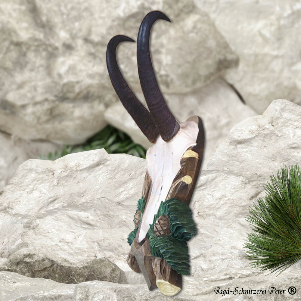 Gamsschild Kiefer, mit Zapfen aus einem Stück Holz geschnitzt.
