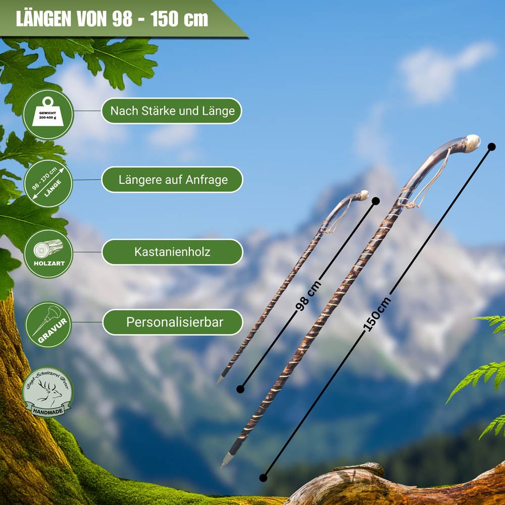 Jeder Wanderstock ein von der Natur gefertigtes Einzelstück in verschieden Stärken wie auch im Aussehen.Gefertigt werden diese Stöcke in einer deutschen Stockmanufaktur aus ausgesuchter Edelkastanie.Ein guter Wanderstock verbessert das Gleichgewicht des Körpers und gibt Ihnen die nötige Sicherheit bei einfachen Wanderungen sowie auch im Gebirge.Unsere Jagd und Wanderstöcke werden aus ausgewählter Edelkastanie oder Haselnussholz gefertigt und sind in verschiedenen Längen und Stärken erhältlich. Auf Wunsch fertigen wir Ihnen Ihre Wanderstöcke aus Holz auch mit der von Ihnen gewünschten Inschrift. Dadurch können Sie jeden Wanderstock von uns personalisieren lassen und erhalten dadurch ein individuelles Geschenk über welches sich jung und alt erfreut.Der Stock wird oben am Holz-Wurzelknauf mit einer Schlaufe aus echtem Leder und am unteren Ende mit einer Bergstockspitze versehen. Auf Anfrage erhalten Sie weitere Spitzen oder Gummikappen für Ihre Wanderstock von uns.