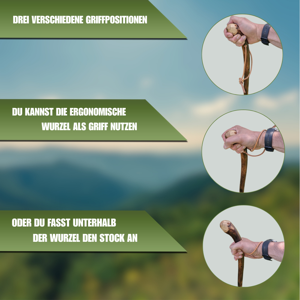 An der oberen Hälfte des Wanderstocks wird durch ein vorher gebohrtes Loch eine Lederschlaufe angebracht, die als Griff dient und es ermöglicht, den Wanderstock bequem zu tragen oder aufzuhängen.