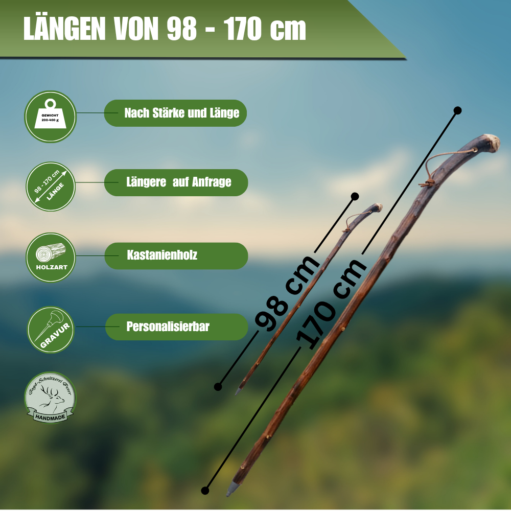 Angebotene Längen des Stockes: 98 cm, 110 cm, 120 cm, 130 cm, 140 cm, 180 cm(siehe Optionen)