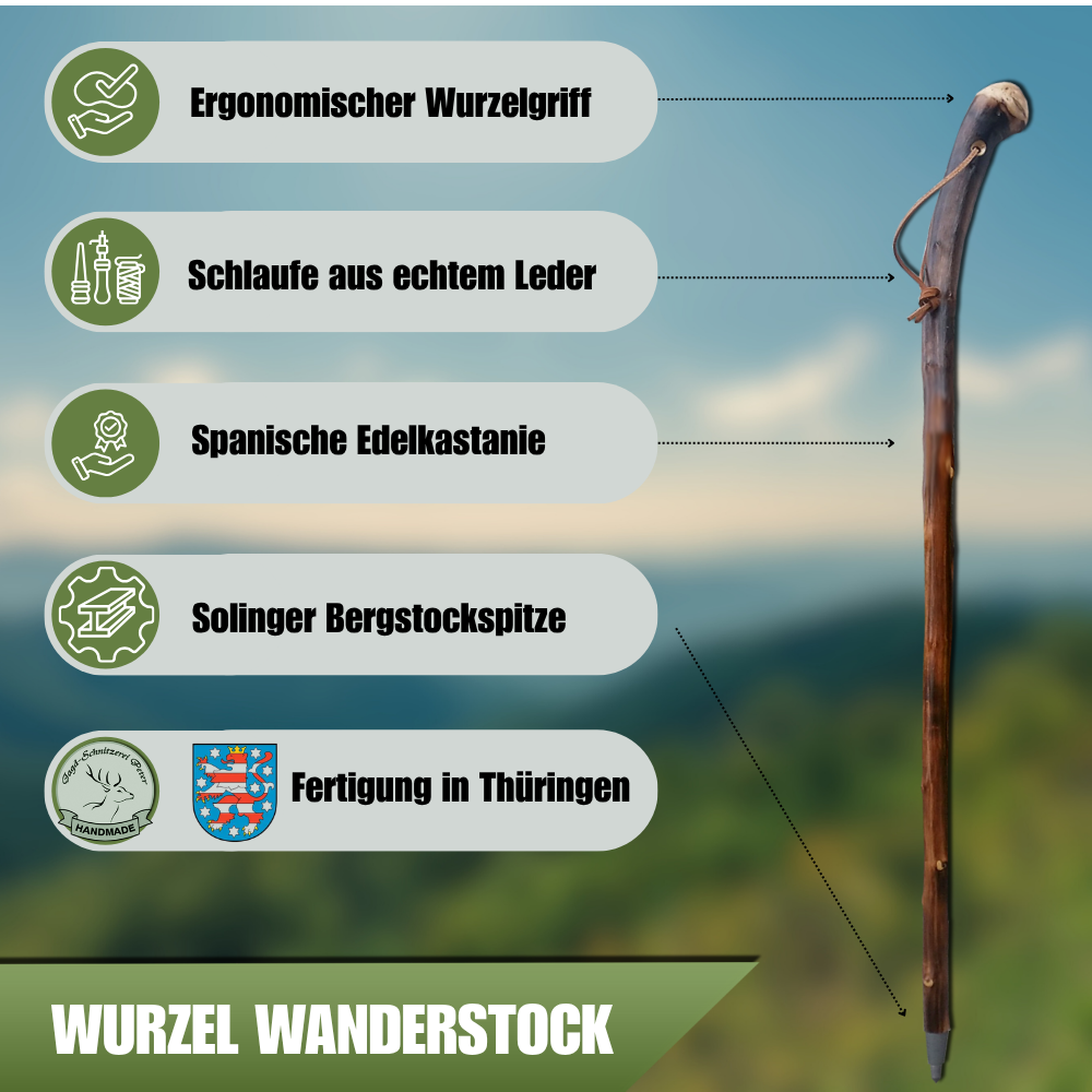 Der hier zu sehende Wanderstock ist ein Wurzelwanderstock, der aus Edelkastanie gefertigt wird.