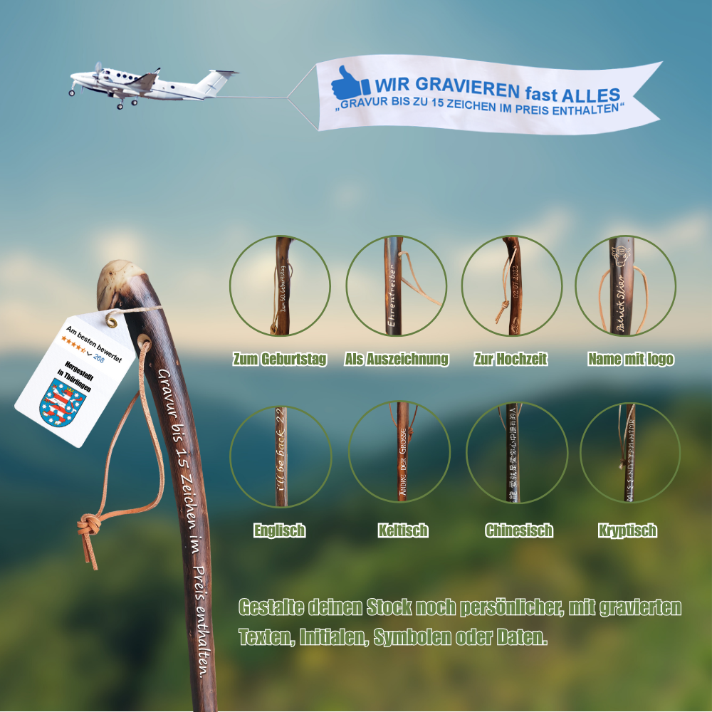 Hier können Sie Ihre gravierte Inschrift, bei der 15 Zeichen bereits im Preis enthalten sind, mit einem gravierten Symbol oder Sternzeichen kombinieren. Wir bieten Ihnen Gravuren mit verschiedenen Motiven, Sternzeichen für unsere Wanderstöcke, Jagdstöcke, Alpenstangen und sonstige Artikel aus Holz. Dadurch haben Sie die Möglichkeiten alle von uns angebotenen Stöcke in ein ganz persönliches Geschenk zu verwandeln. Sei es für Jagdliche Geschenke, für Hochzeiten, Vatertag, Muttertag, Geburtstage, Jubiläum, Weihnachten und viele mehr.